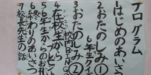 2026年2月27日 六年生を送る会 後編 なかよし班でのゲームで、楽しいひと時を過ごした子どもたち。 体育館にて送る会を続けます。 まずは、なかよし班のメンバーか... カテゴリー 2025年度/日々の活動の様子
