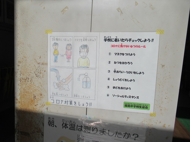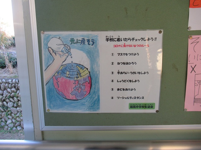 ホーム > 日々の活動の様子 / 2020年度 飯南中学校生徒会から 飯南中学校生徒会から 「コロナに負けない6つのルール」が書いてあるポスターをいただきました。 6つのルールをしっかり守りましょう。 昇降口と二階の掲示板に貼りました。 ルールを守れているか確認してみましょうね。 シェアする Twitter でシェア はてなブックマークに保存 LINE でシェア Facebook でシェア Pocket に保存 Feedly で購読 関連投稿 2021年度 / 日々の活動の様子 (1・2・3年)授業風景 2021年度 / 日々の活動の様子 ー カプラ ー 2021年度 / 日々の活動の様子 (3年・6年)モルック 2022年度 / 日々の活動の様子 〈1・2年〉みんなのお願いは? 2021年度 / 日々の活動の様子 ー5・6年教室 床修繕ー 2023年度 / 日々の活動の様子 〈1・2・3年合同〉マラカスづくり 前の投稿 2021年スタート 次の投稿 おはようマラソン 始まりました 1月13日