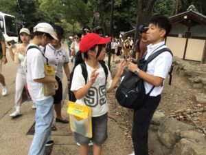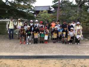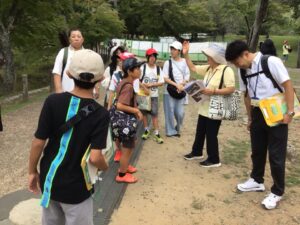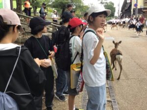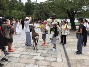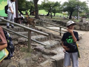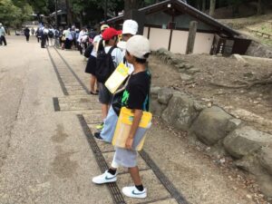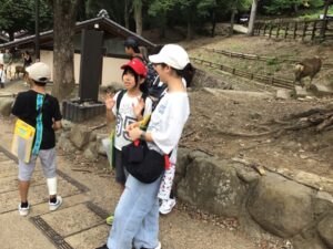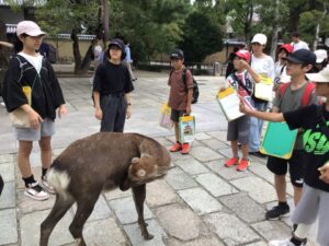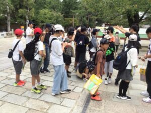 子どもたちは無事に昼食をとり、ガイドさんに案内してもらいながら、東大寺周辺の学習に取り組みました。