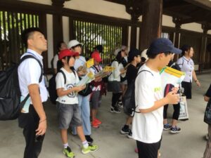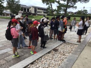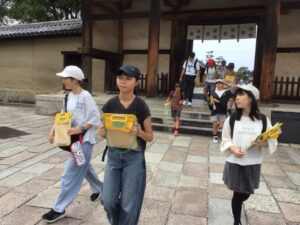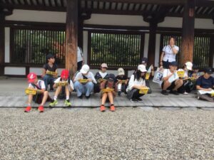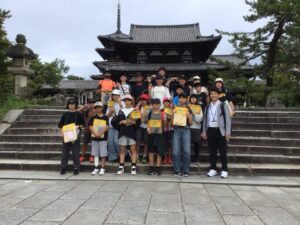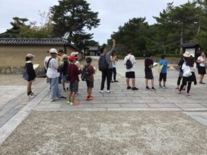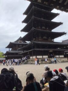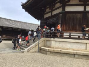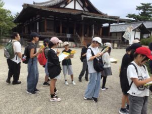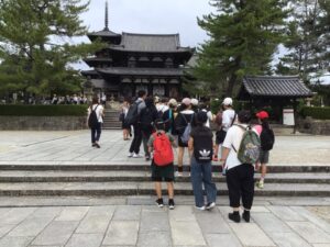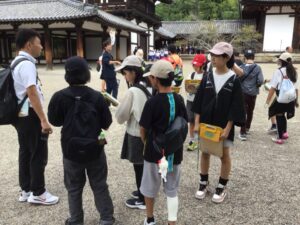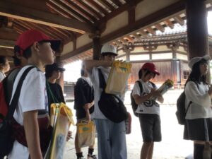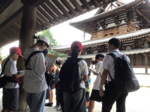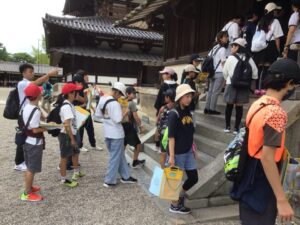 柿野小学校6年生10名は、世界遺産の法隆寺に到着。
