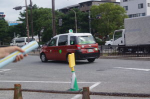 四つ葉クローバー号と遭遇。ヤサカタクシーの四つ葉マークをつけたタクシーと遭遇するのはたいへんまれだそうです。