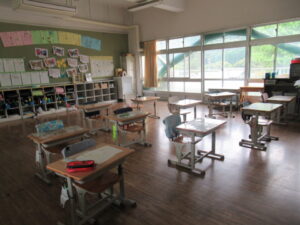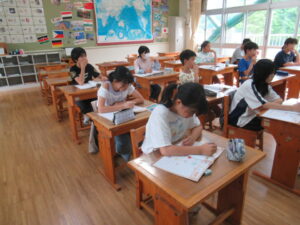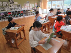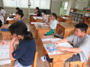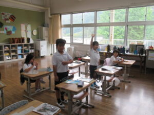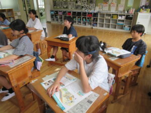 外国語の時間でした。ESTの先生とともに学習していました。英語で道案内できるよう、今日は方向等の英語表現を学んでいました。