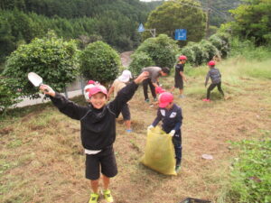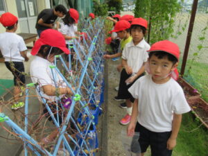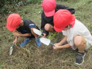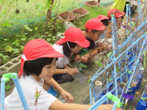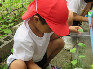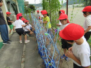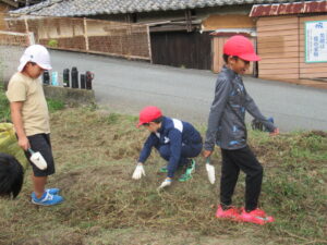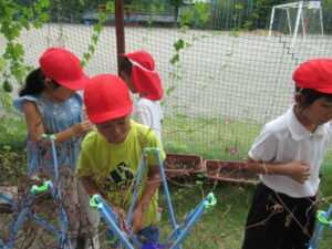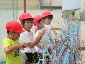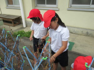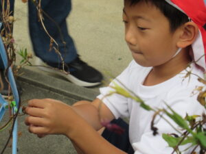 1年生は、せいかつの時間です。自分たちで育てたアサガオの種を集めていました。
