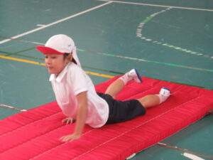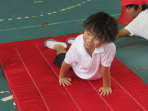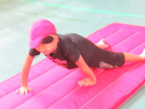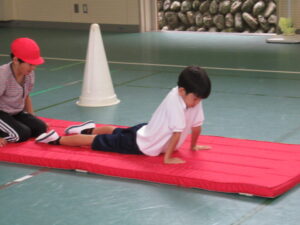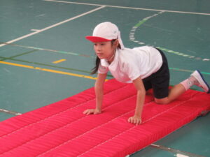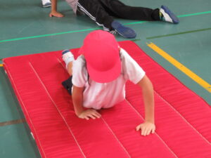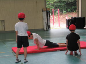 体育館に行くと、マットでの技に入る前の準備運動をしていました。