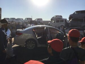 まだまだ乗れそうな車の解体。大きな機械の繊細な操作で、必要なものを取り出しプレス機に。