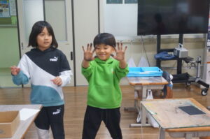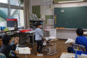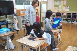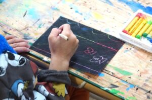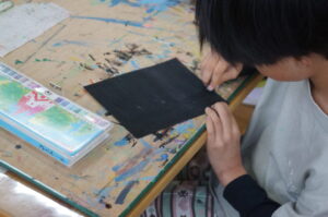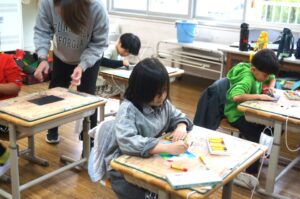 2年生は図工の時間、ひっかいて色とりどりの線で表現します。