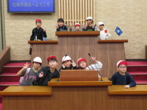 本会議場では市議会議員の座席に座ってお話を聞き、議員さんのように指定席に立って質問するなど、貴重な体験をさせていただきました。