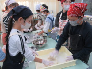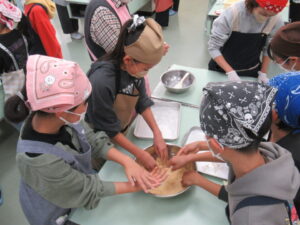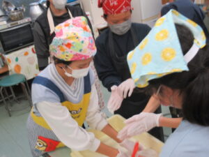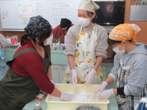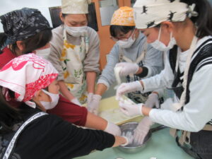 餅がくっついて難しいですが、保護者の方と子どもたちが協力して進めます。