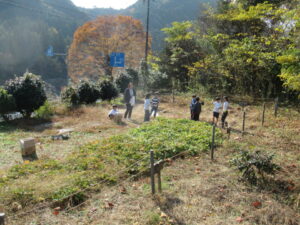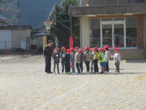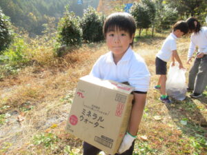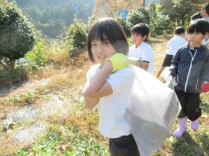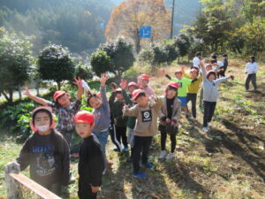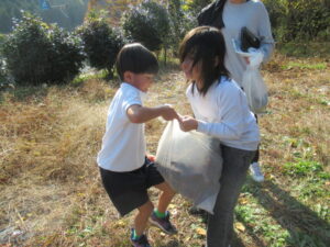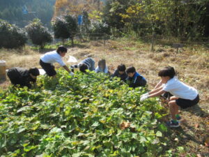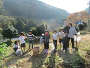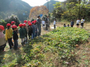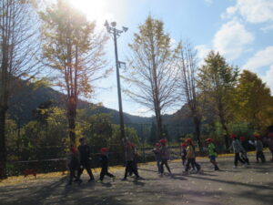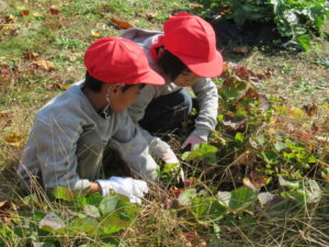 「大きくなっているかな?」1年生が学級園に出発します。舞い落ちるイチョウの葉。冬の到来を感じます。