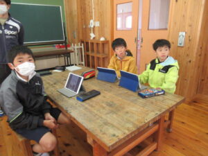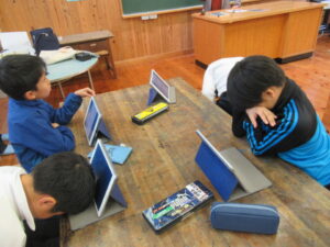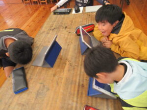 子どもたちも目をつぶり、音色で癒されるか実演中です。