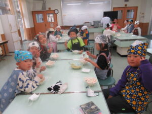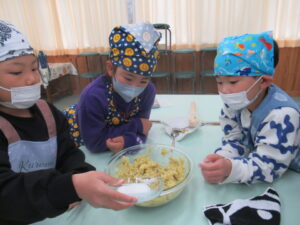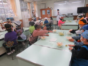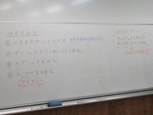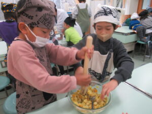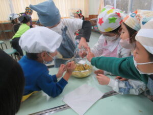 1・2年生が、収穫したさつまいもを使って、せいかつの時間におかし作りをしました。