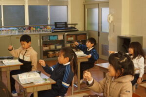 音楽で「わらべうた」を歌に合わせて指で空書きしていました。