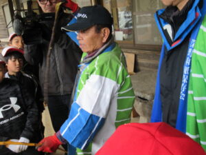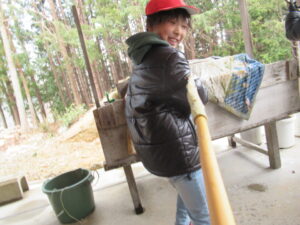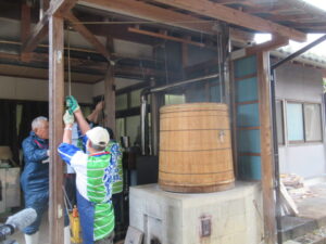 和紙・和牛センターでの紙漉き体験を終え、次は、紙漉きの材料となる木の皮むきです。今日のために朝早くからコウゾ・ミツマタの枝を大釜で蒸していただいていたとのことでした。ありがとうございます。