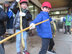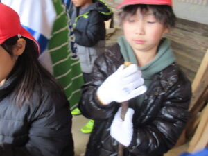 この木を蒸した時のにおいどこかで嗅いだような?子どもたちが口々に言います「サツマイモのにおいする。」そうでした、サツマイモを蒸した時のようなにおいがします。