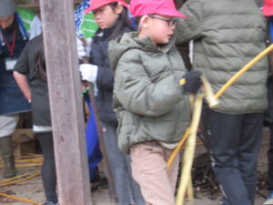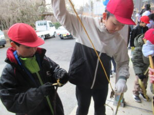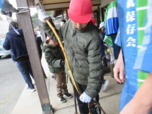 「さあ、いくよ。」息を合わせて綱を引きます。「右もっと引っ張って。」「そこ押さえて。」と声が飛びかいます。保存会の皆さん、本日一番緊張の一瞬です