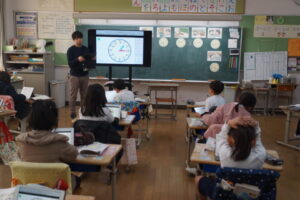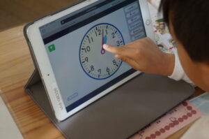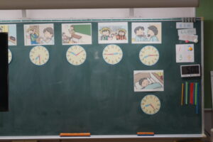 1年生は算数で「なんじなんぷん」時計の学習です。