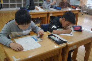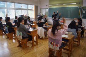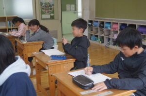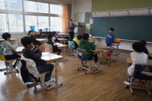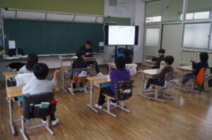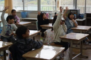 2年生は先生のクイズをみんなで回答していました。