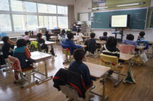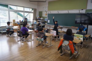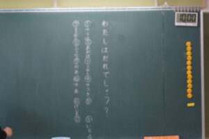 2年生は先生のクイズをみんなで回答していました。