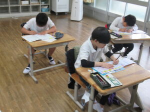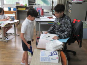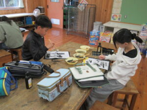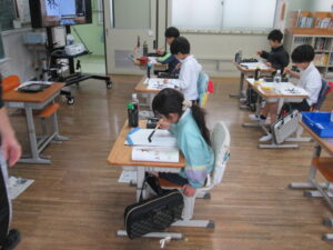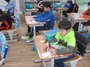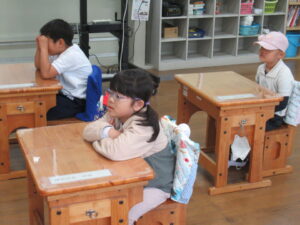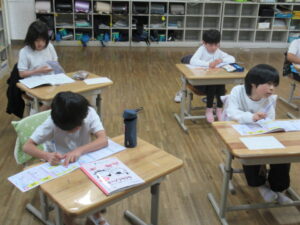 身体測定の後、教室で握力を測定しました。順番待ちの間、課題にもしっかり取り組んでいました。