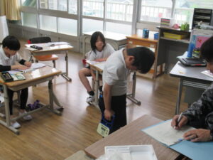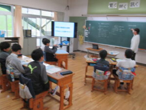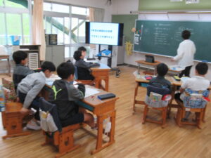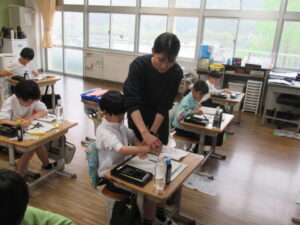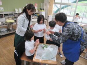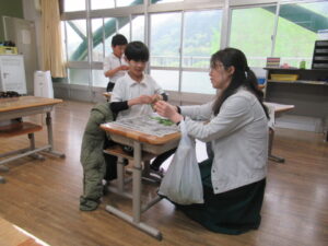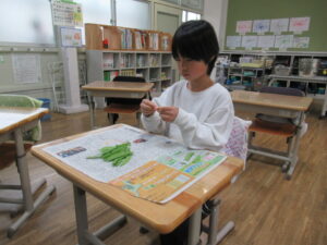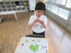 飯南学校給食センターの栄養職員さんに来てもらって、明日の給食で食べるさやえんどうのすじ取りをしました。明日の給食が楽しみです。