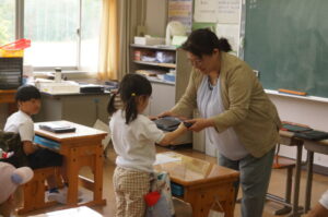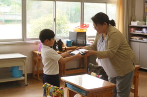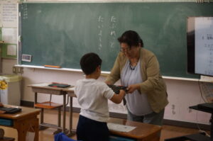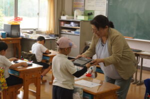 昨日1年生のタブレット貸与式がありました。校長先生から一人ひとりタブレットを受け取りました。